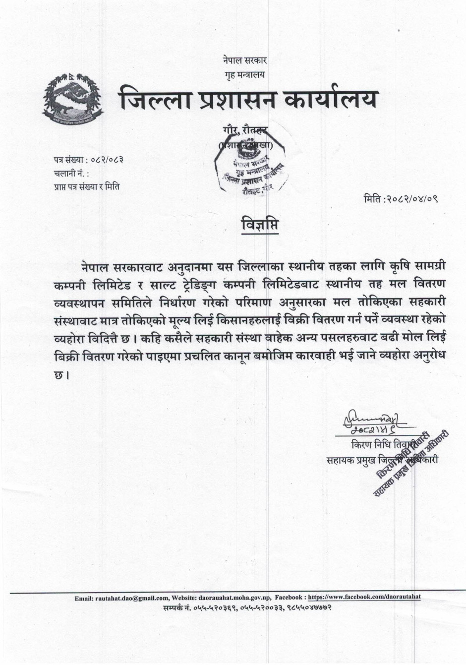 जिल्ला प्रशासन कार्यालय रौतहटको विज्ञप्ति